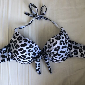 Bikiniöverdel från Shein i vitt leopardmönster. Har storlek XL men är mycket mindre än "en vanlig" XL. Skulle säga ungefär C/D kupa och knyts i både nacken och ryggen. Säljes pga. av förliten storlek. Frakt betalas av köparen.