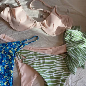 1 blå blommig underdel stl L men mer som m-s, helt set beige/rosa srl L men mer som topp s/m och underdel srl L men som M. Grön sarong och underdel str L men mer som m/vissa fall s alla 110kr kan köpas enskilda. Aldrig använda! 💕