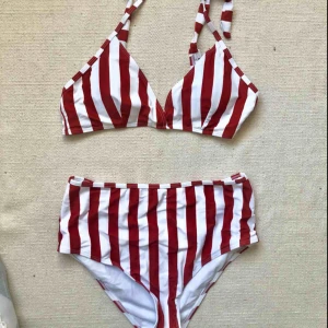 Superfin randig bikini från Shein. Hög midja. Rostfärgad/vit. Aldrig använd. Precis köpt men fel storlek tyvärr:/ 90 för båda delarna. Frakt tillkommer