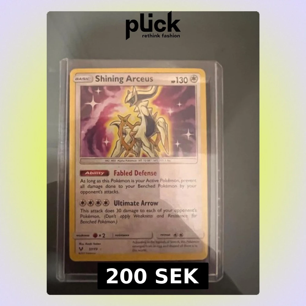 Shining Arceus är ett samlarkort från Pokémon-serien med en unik och glänsande design. Perfekt för dig som älskar Pokémon och vill ha något speciellt i din samling! Kortet har coola attacker och är ett måste för både spelare och samlare. Skick: bra, med tydliga färger och detaljer.