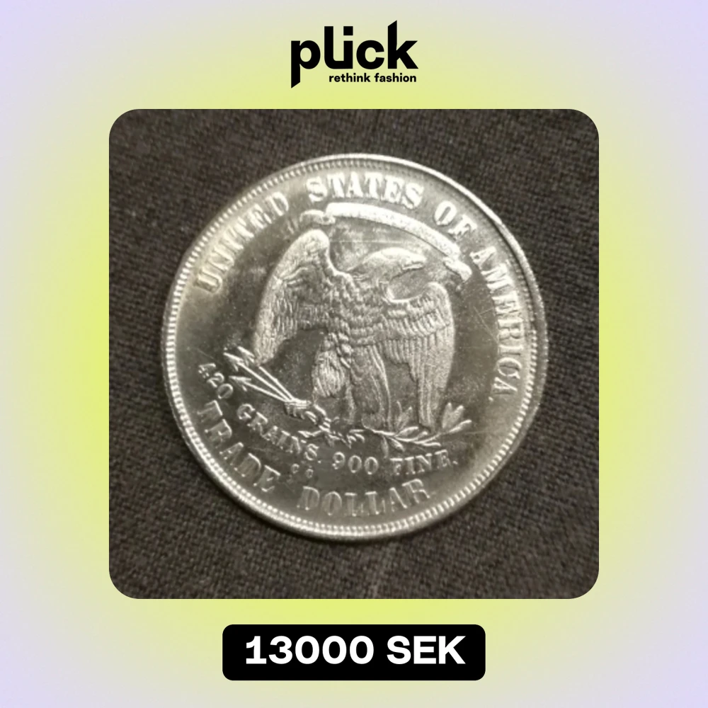 Silvermynt med en örn på ena sidan och en kvinna på den andra. 5 har texten "UNITED STATES OF AMERICA" och "TRADE DOLLAR" på ena sidan och "IN GOD WE TRUST 1874" på den andra. Silvermynt med en örn på framsidan. Mynten har inskriptionen UNITED STATE