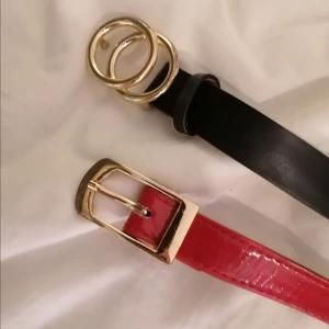 Två skärp med guldspänne, båda är 105cm långt men går att göra fler hål om så önskas, 20kr ST eller båda för 30kr, köparen står för frakten