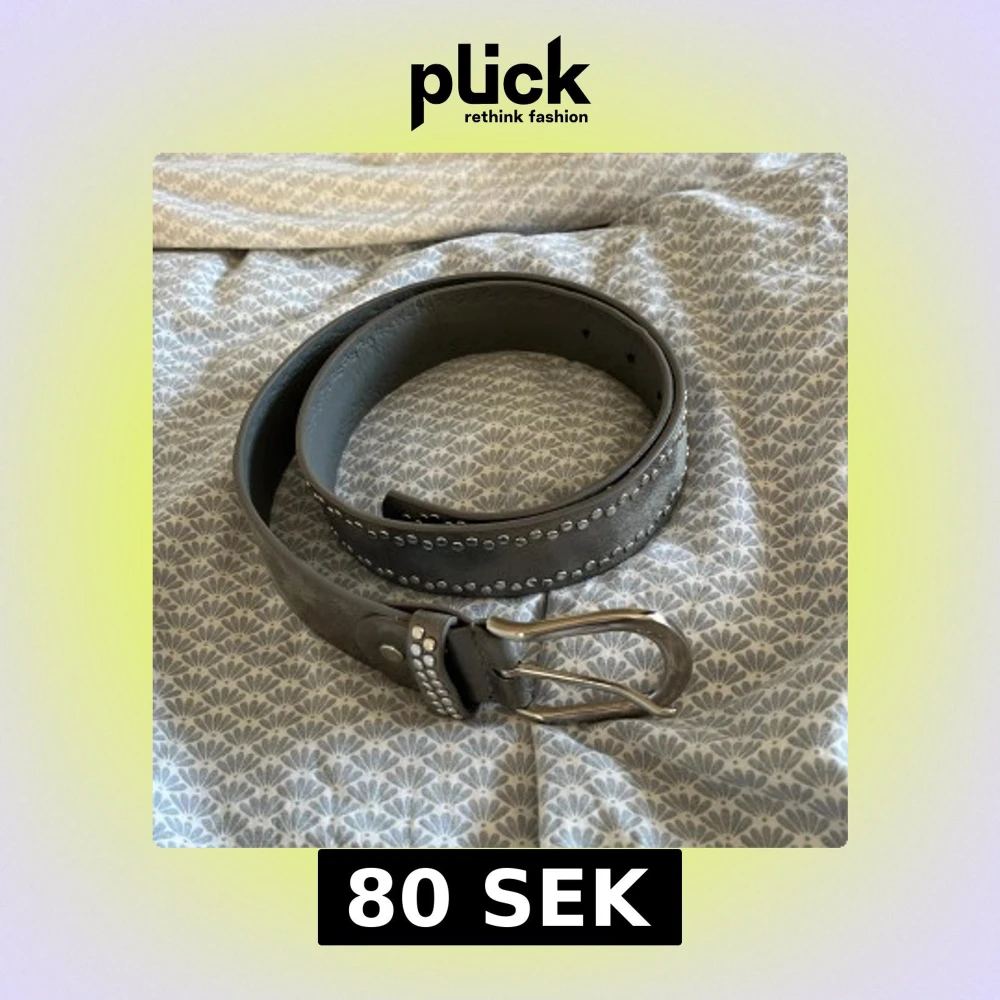 Snyggt grått bälte med silverfärgade nitar längs kanterna och en cool silverspänne. Bältet är brett, vilket ger en schysst och robust känsla. Perfekt för att ge outfiten lite edge med metalliska detaljer. Passar s/xs och är i fint skick