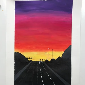 Min tavla som jag har målat som visar solnedgången på en väg