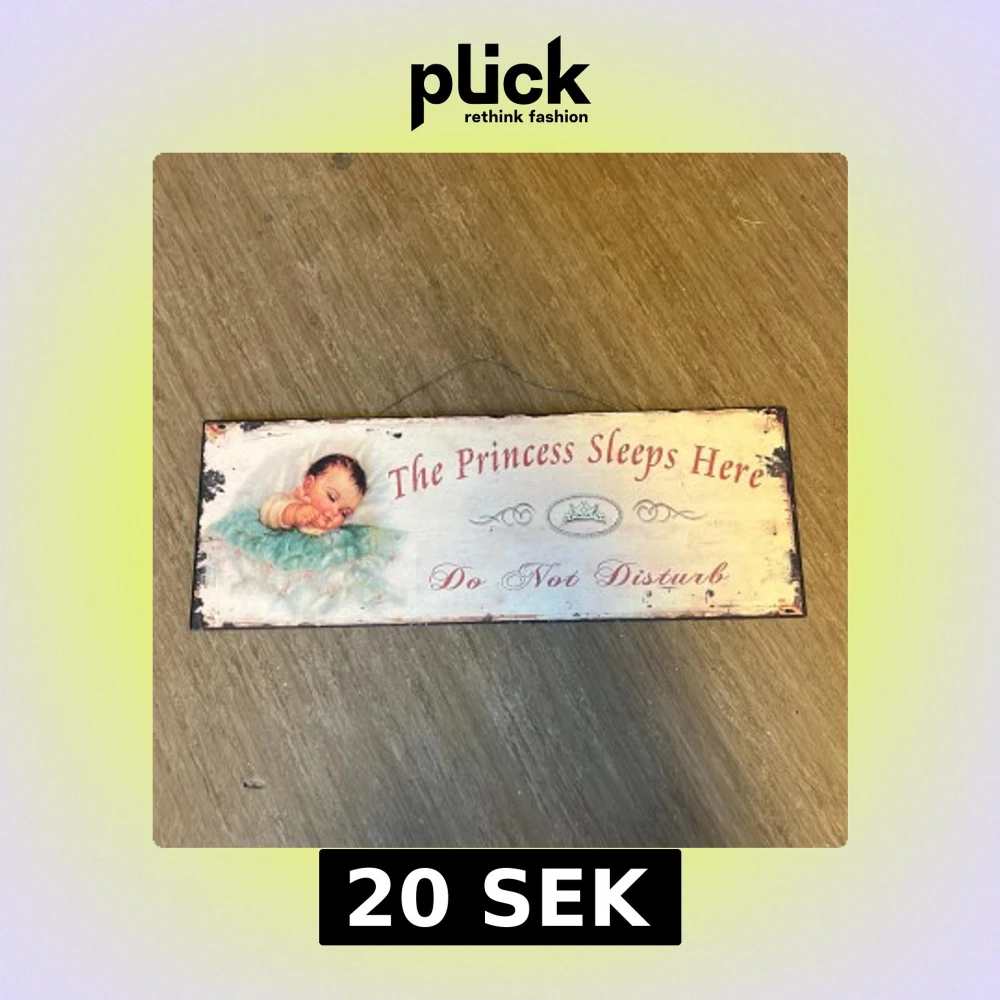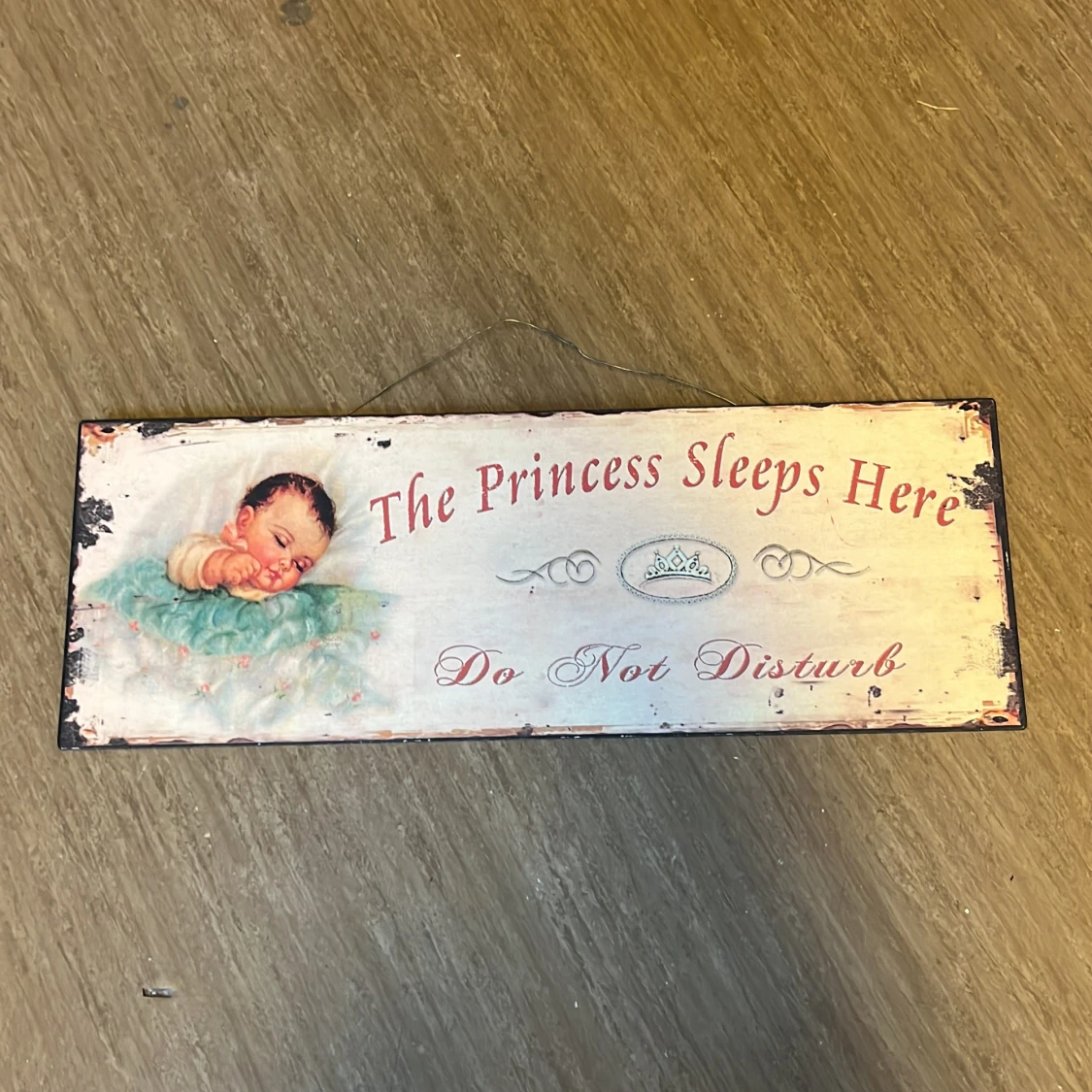 Söt rektangulär skylt i trä med vintage-look och texten 'The Princess Sleeps Here' samt 'Do Not Disturb'. Motiv av en bebis på en filt och en liten krona. Skylten har upphängningstråd och passar perfekt till barnrummet.