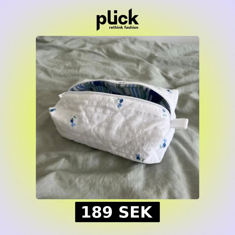 Superfin vårig necessär med blåa körsbär och randigt tyg på insidan, perfekt för smink eller hudvård. 🫐🩵 Måtten är cirka: Höjd: 10cm Längd: 21cm Bredd: 11cm