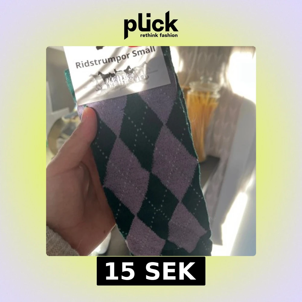 Snygga ridstrumpor i storlek small med klassiskt rutig mönster i grönt och lila. Perfekta för dig som gillar att sticka ut i stallet. Strumporna är långa och tunna, vilket gör dem smidiga att ha i ridstövlar. Märke Dollarstore.