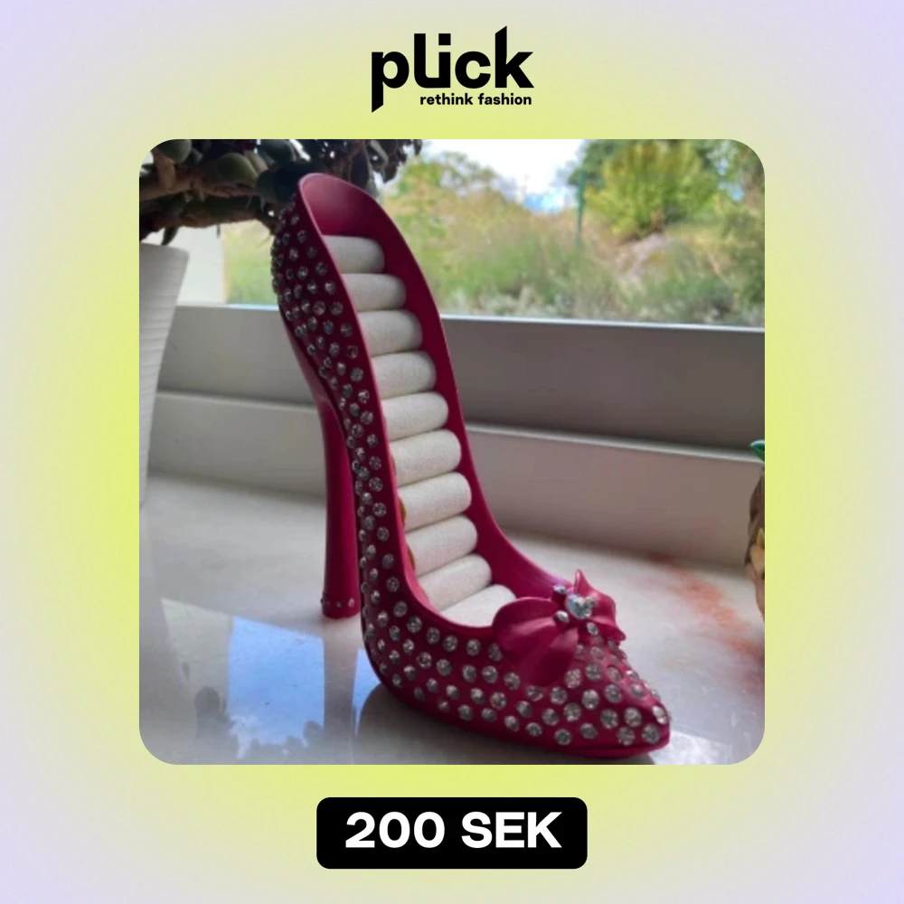Rosa glittrande klacksko för ringar och örhängen. Använd ett fåtal gånger, men är som ny. Perfekt för dina smycken!