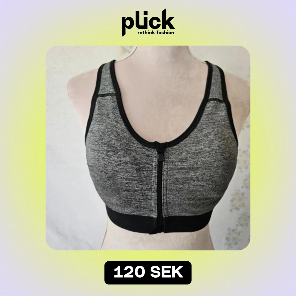 Säljer en grå sport-bh med svarta detaljer och dragkedja framtill. Den har justerbara axelband och är perfekt för träning. Materialet är mjukt och stretchigt för bästa komfort.