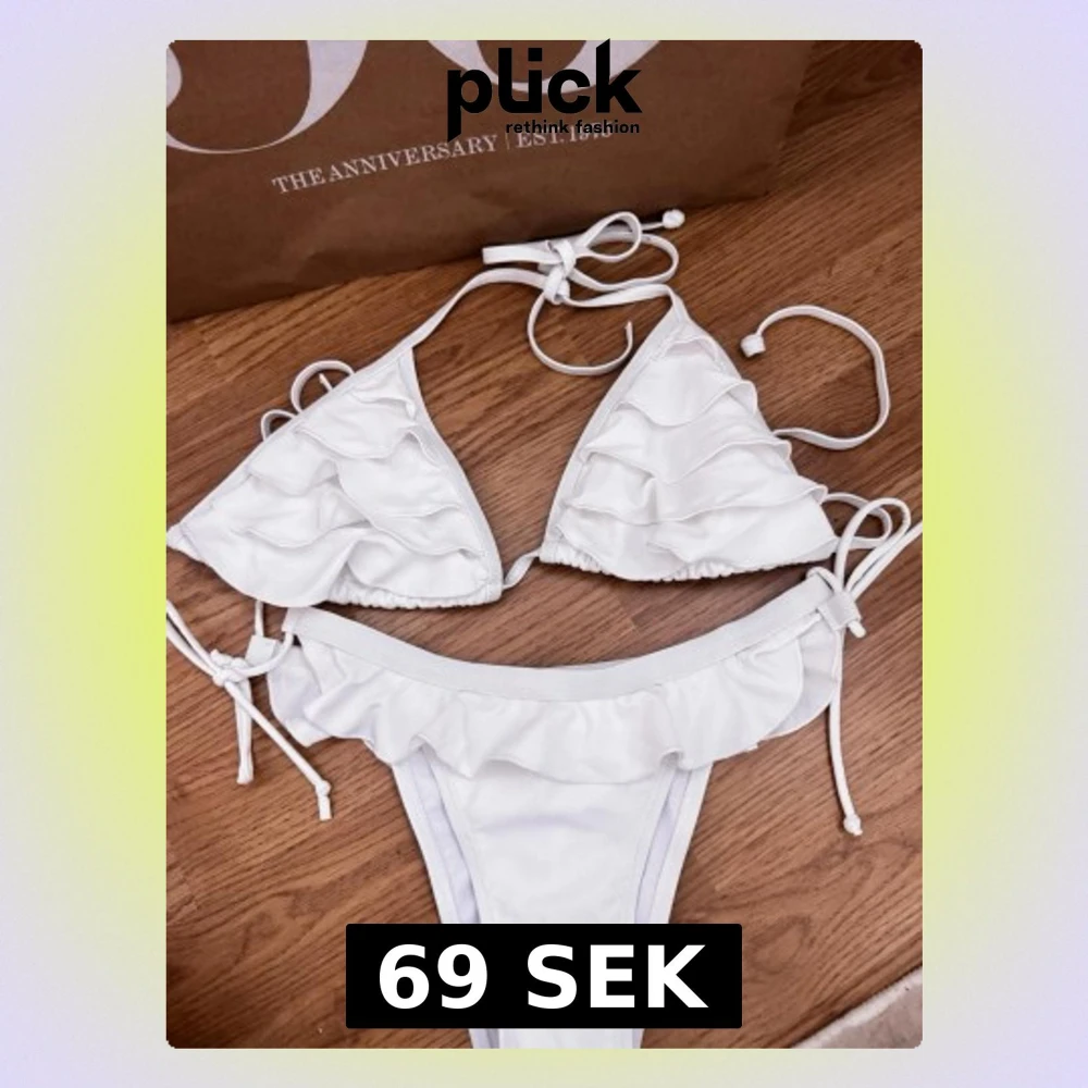 Vit bikini med volangdetaljer och knytband. Använd en gång men tyvärr för stor på mig