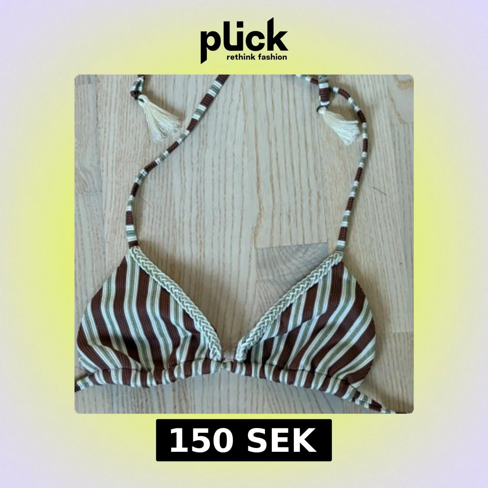Snygg bikiniöverdel från Calzedonia med bruna och vita ränder. Den har knytband med tofsar och en flätad detalj längs kanterna. Perfekt för sommarens stranddagar! Inte använd