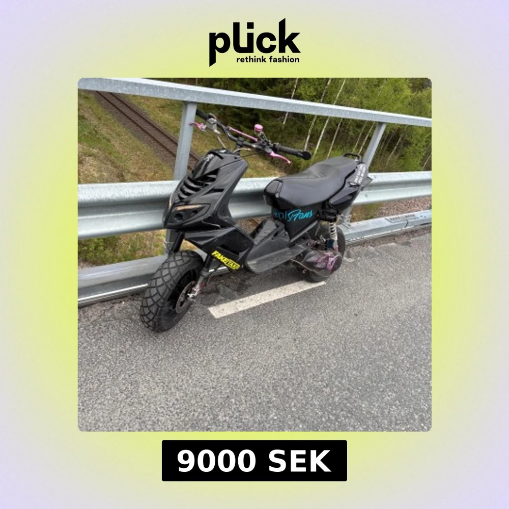Säljer en svart moped med rosa handtag och bromsdetaljer. Sadel med Coca-Cola-tryck och sidodekal med OnlyFans-logga. Mopeden har grova däck och sportigt utseende. Vissa delar och motordelar syns lösa på marken. Köp den för 9000 finns i värnamo de e bara o skriva fps med lite trim delar