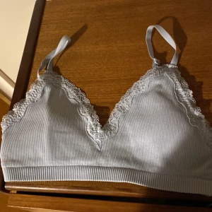 En ljusblå bh/topp med inlägg som har spets i kanten.💙 Det är medvetna hål på varje insida för att kunna flytta runt inläggen som kan knöglas ihop efter tvätt🤗Inget som varken syns eller känns och i övrigt som nyskick.❤️ ej säker på exakt storlek (XS-S)
