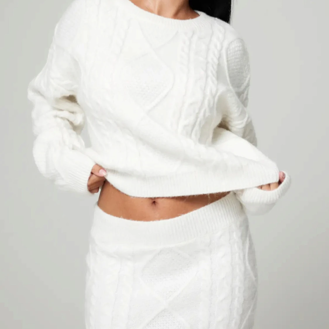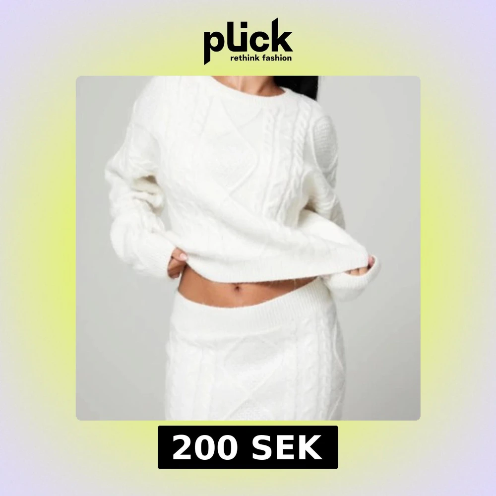 Supersnygg vit stickad kortkjol med bred resår i midjan och klassiskt kabelstickat mönster. Kjolen har en mjuk och mysig känsla, med en matchande stickad tröja för en hel outfi.