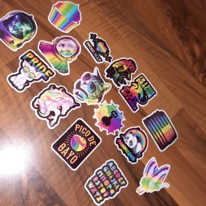 15st pride klistermärken. Tror att jag köpte dom från en privatperson eller bara någon random sida på internet fär typ 5 månader sen. Har använt ett klistermärken och den satt bra. Om du vill ha någon speciell av dom så kan du bara skri a.❤️🧡💛💚💙💜🩷