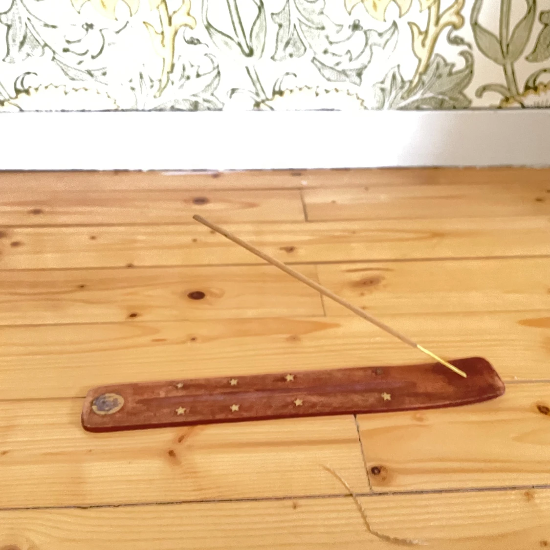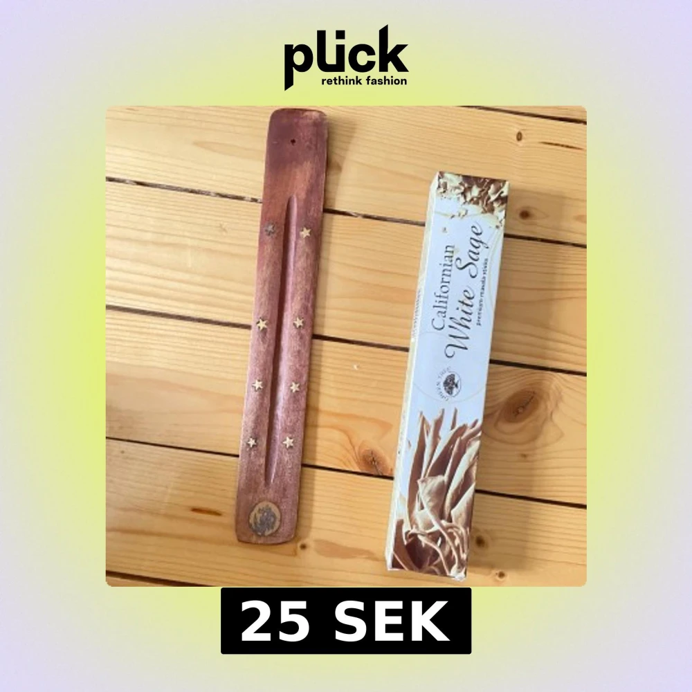 Set med premium Californian White Sage rökelsepinnar och en dekorativ trä-rökelsehållare med stjärndekor. Perfekt för avkoppling och meditation. Rökelsepinnarna är oanvända och hållaren är i gott skick med mindre bruksspår. Jag har bara använt en. Nypris ca 70kr