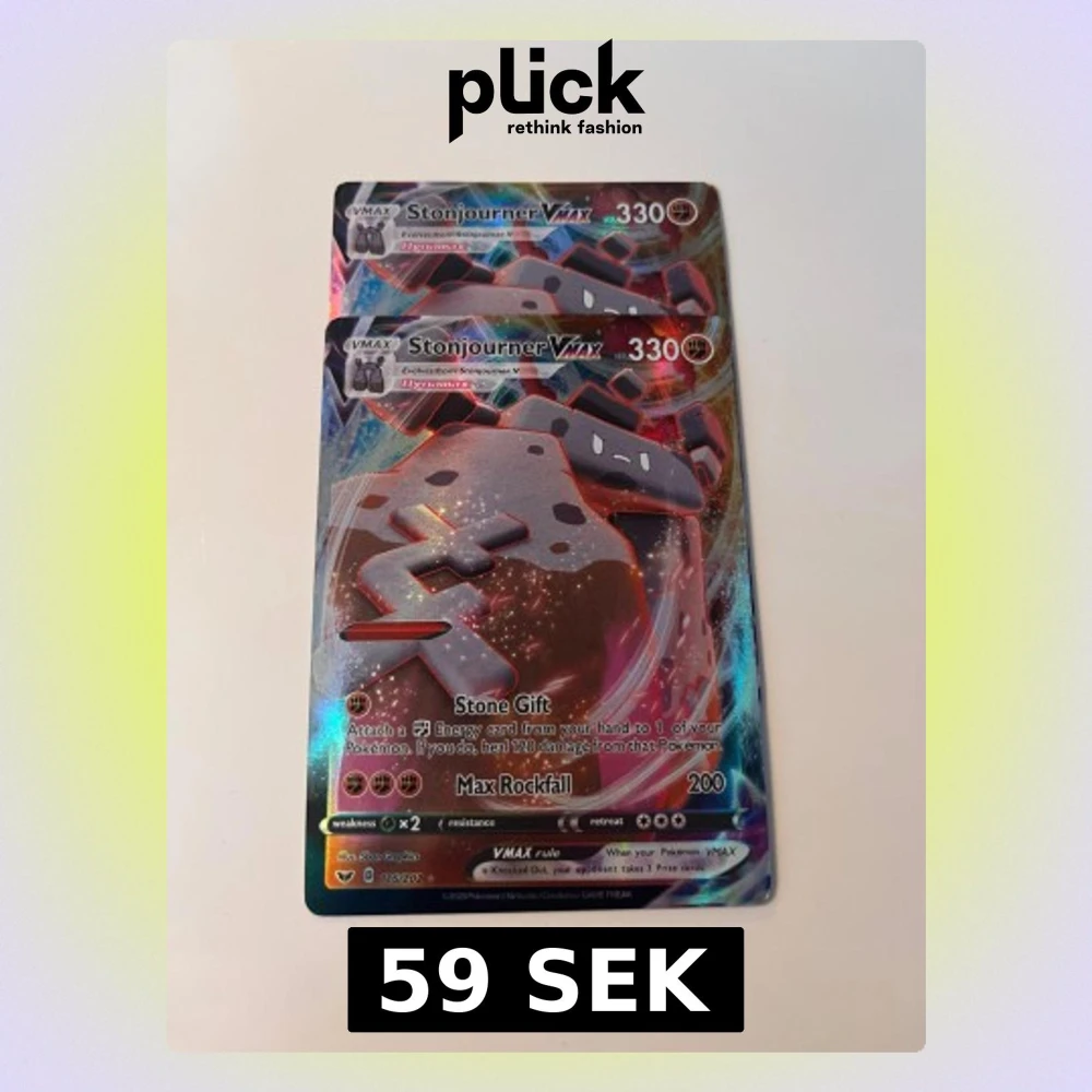 Två coola Stonjourner VMAX Pokémonkort med glittrande design! Perfekt för dig som samlar eller vill boosta din lek med en stark VMAX. Korten har 330 HP och unika attacker som Stone Gift och Max Rockfall. Ett måste för Pokémon-fans!
