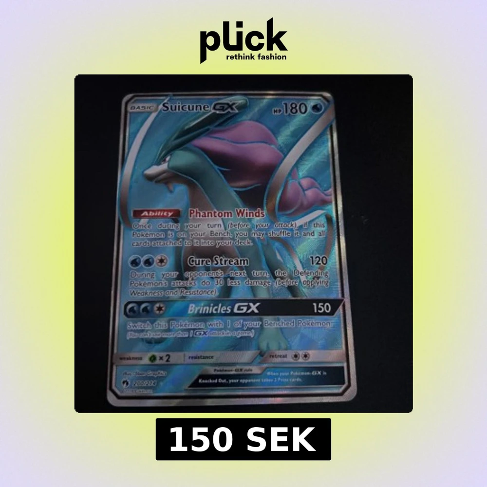 Säljer ett Suicune GX Pokémonkort med 180 HP. Kortet har förmågan Phantom Winds och attackerna Cure Stream och Brinicles GX. Perfekt för samlare eller spelare som vill stärka sin kortlek. Kortet har en holografisk yta som ger det en extra glans. Skriv om ni är intresserade.