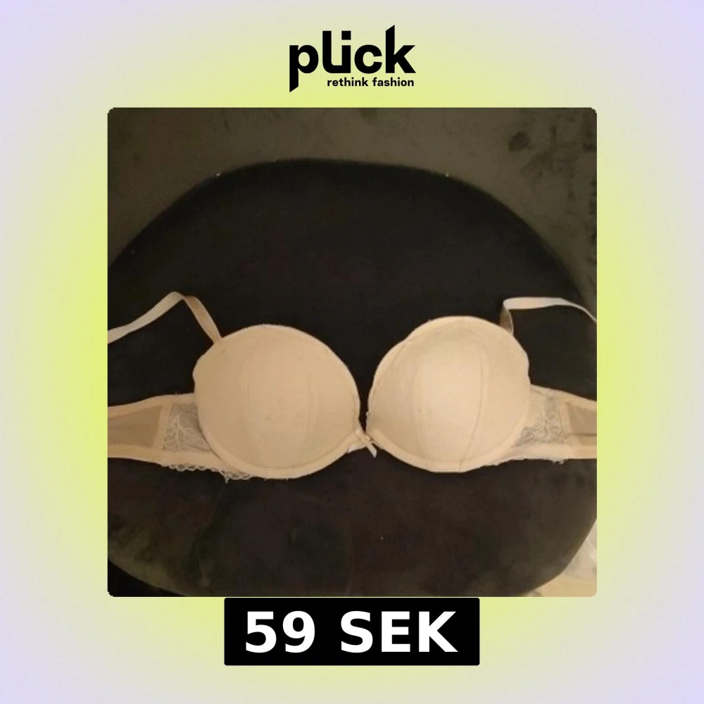 Säljer en elegant beige bh med spetsdetaljer på sidorna. Den har justerbara axelband och en klassisk design som ger bra stöd. Perfekt för att känna sig bekväm och stilren.