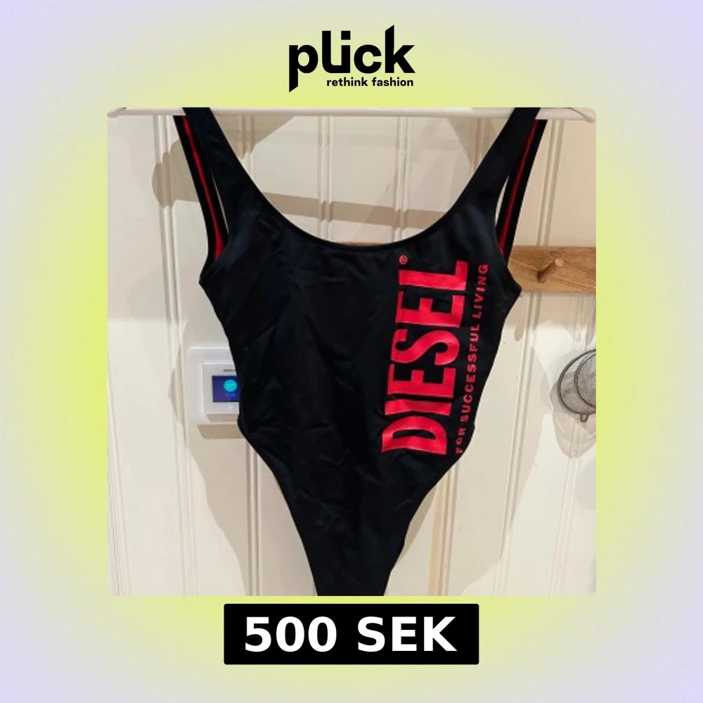 Snygg svart baddräkt från Diesel med röd logotyp på framsidan. Den har en djup rygg och breda axelband.