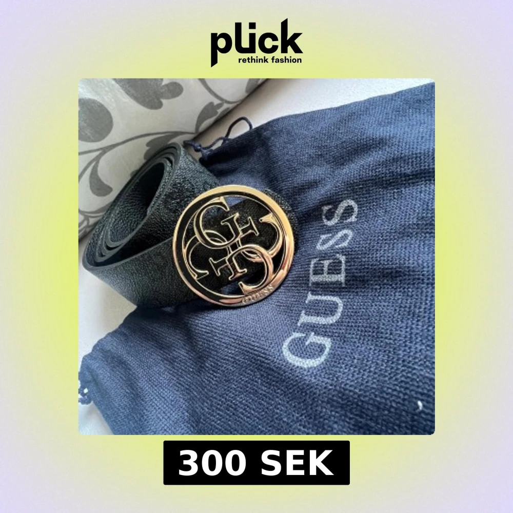 Snyggt svart bälte från Guess med en stor, rund guldfärgad logotyp som spänne. Bältet har en elegant textur och kommer med en praktisk förvaringspåse. Perfekt för att ge en stilren touch till din outfit.