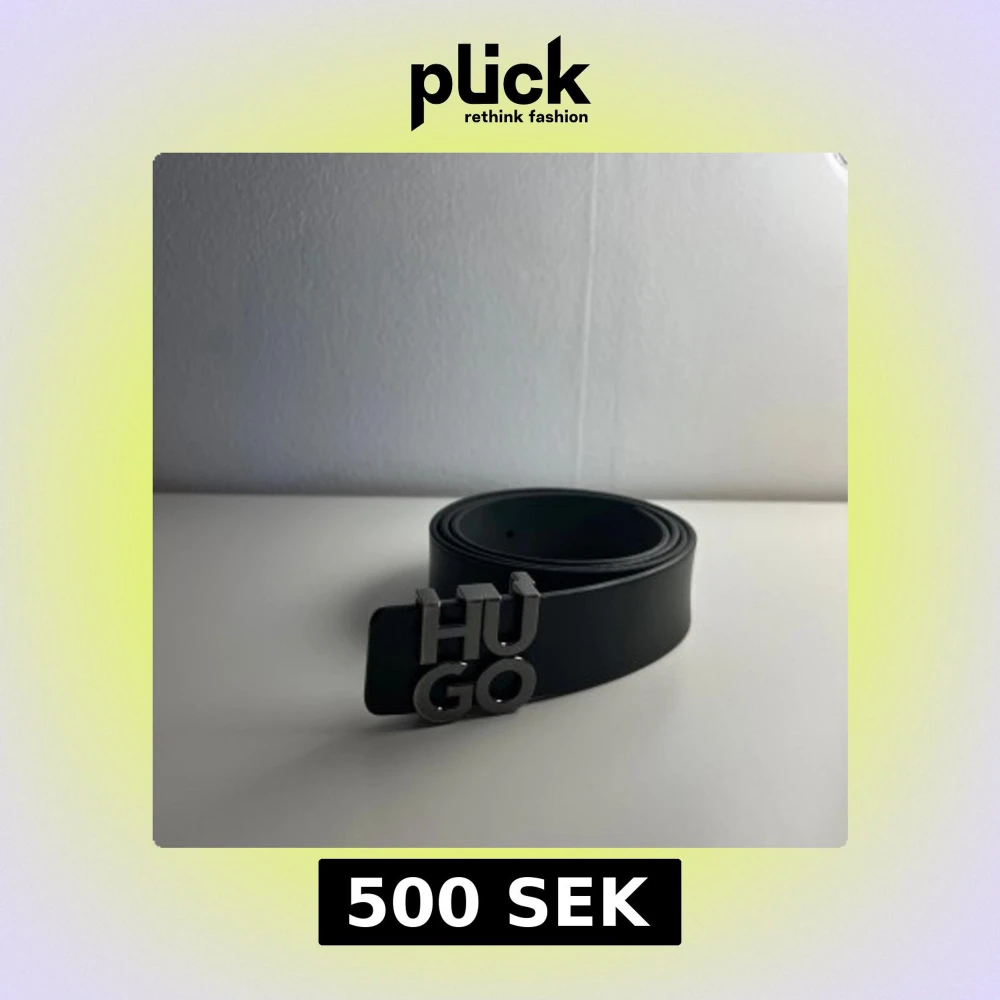Snyggt svart bälte från Hugo med ett stilrent metallspänne där det står 'HUGO' i stora bokstäver. Bältet är gjort i slätt skinn och passar perfekt till jeans eller kostymbyxor. Enkel och modern design som lyfter din outfit.