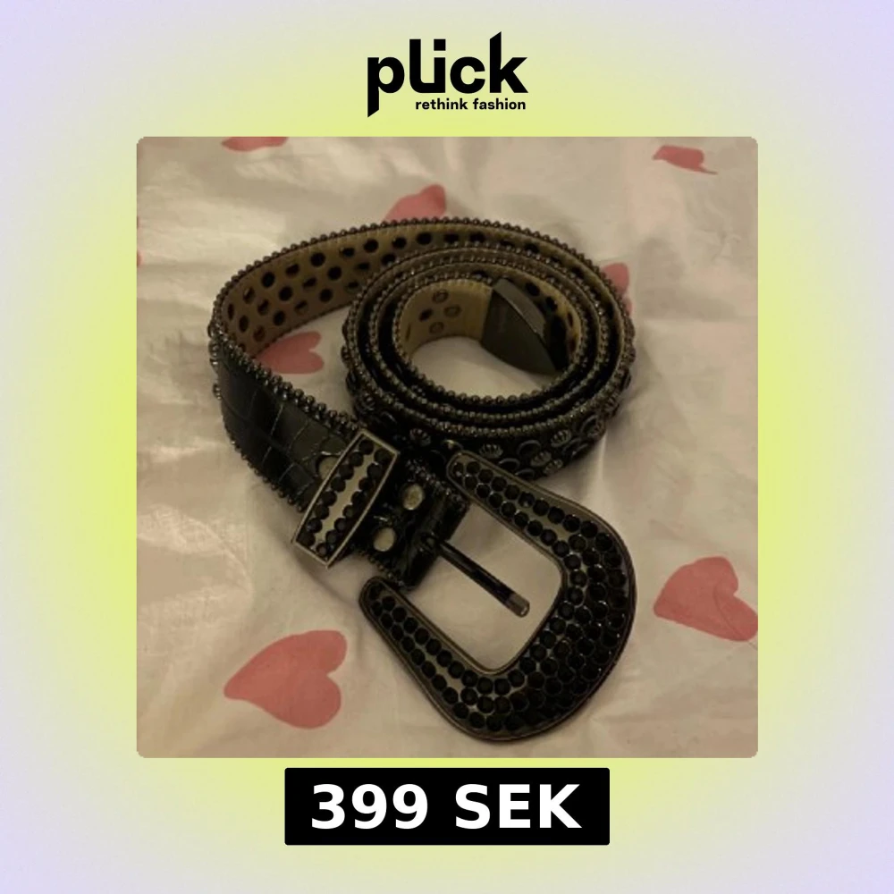 Säljer ett svart bälte från B.B. Simon med glansig yta och massor av svarta nitar och metallringar. Bältet har en stor, dekorerad spänne och coola detaljer längs hela remmen. Skriv för fler bilder!!