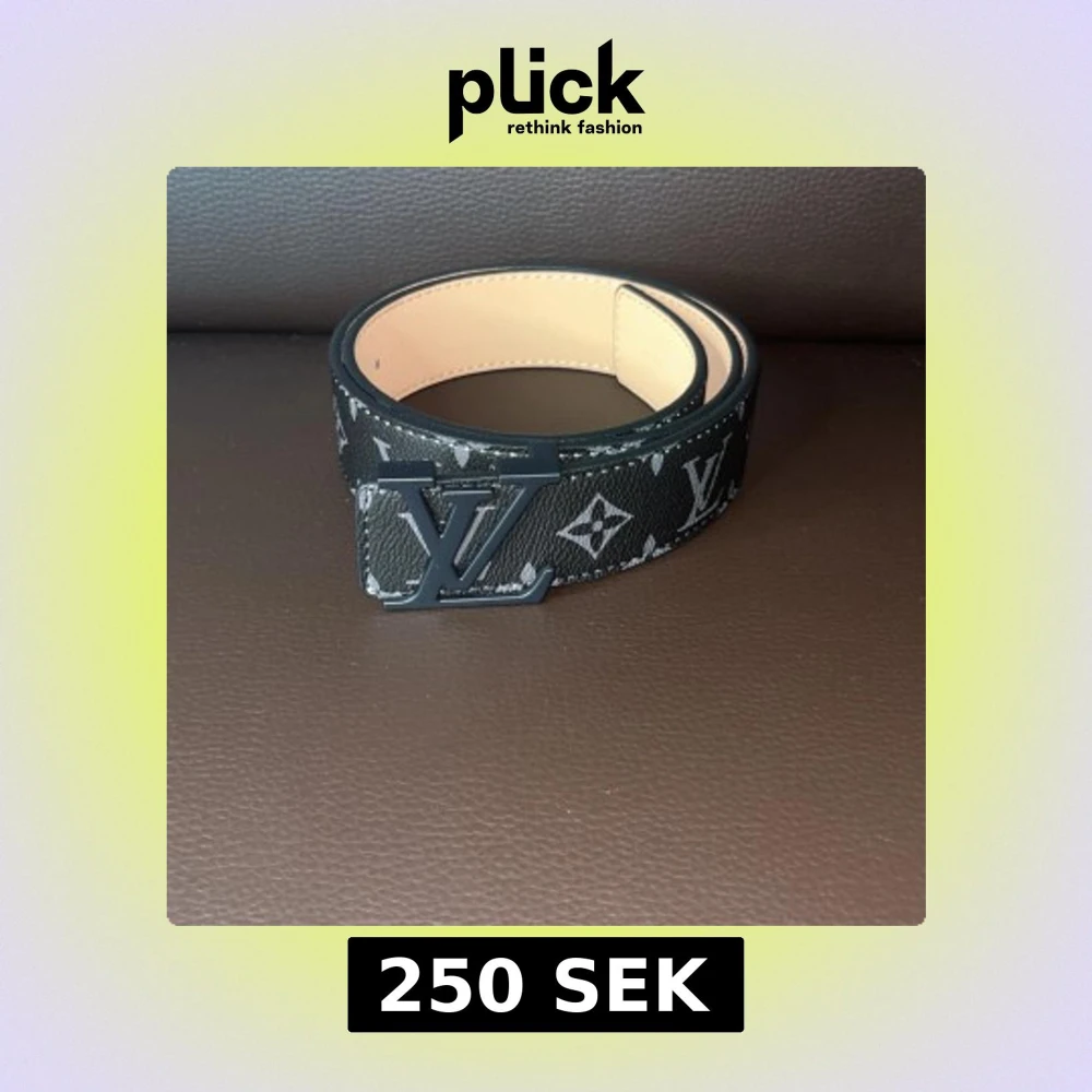 Säljer ett svart bälte från med klassiskt monogrammönster i vitt och grått. Bältet har en bred design och en svart logga som spänne. Tillverkat i skinn med en lyxig känsla och snygg kontrast mellan insida och utsida.