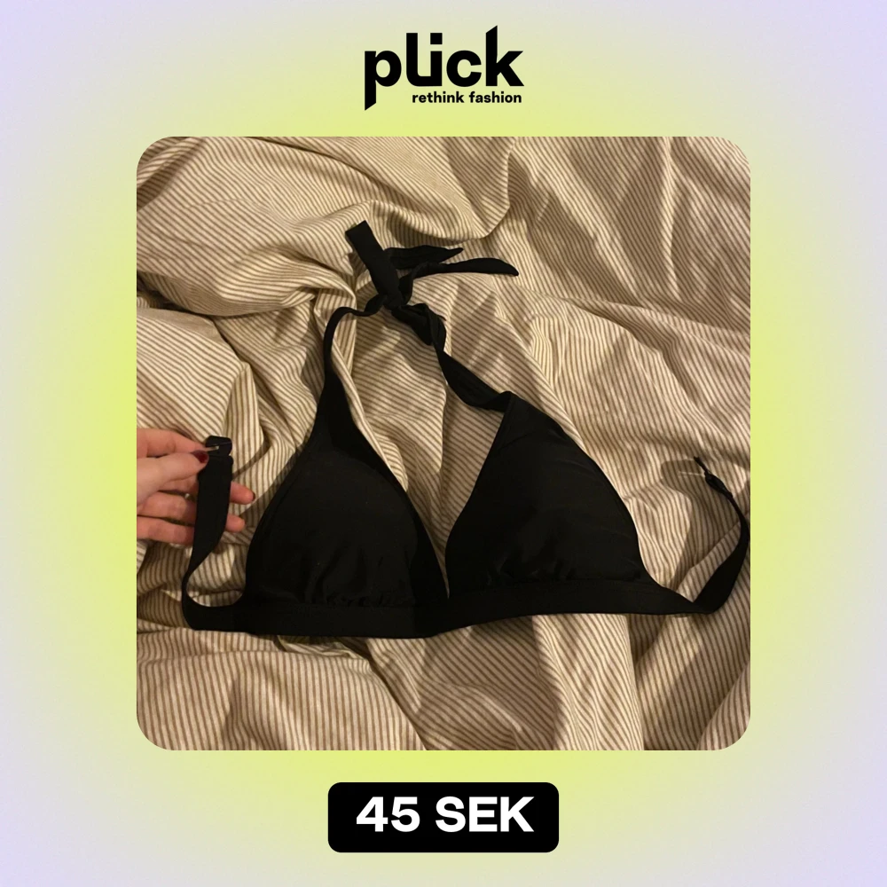 Säljer en stilren svart bikiniöverdel i trekantsmodell. Den har knytband i nacken och ryggen för justerbar passform. Perfekt för sommarens stranddagar eller poolhäng. Materialet känns mjukt och bekvämt mot huden. Passar bra till både bad och solning. 🖤använd i pool / luktar lite klor