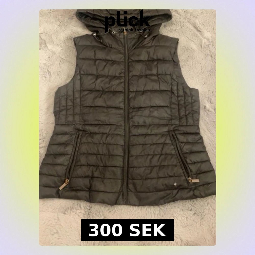 Svart dunväst från Zara med huva och två fickor med dragkedja. Västen har ett quiltat mönster och stängs med dragkedja framtill. Perfekt att slänga över en hoodie när det är kyligt ute. Snygg och enkel design som funkar till många stilar. Kan eventuellt tänka mig gå ner i pris
