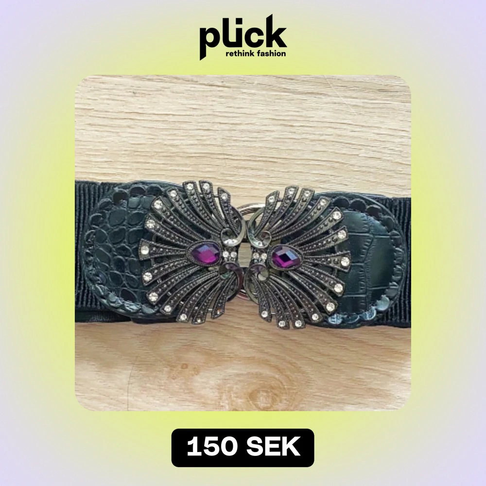 Säljer ett snyggt svart elastiskt bälte med ett riktigt coolt spänne. Spännet har en unik design med lila stenar och silverdetaljer som ger en glamorös touch. Bältet är gjort av ett elastiskt material som gör det bekvämt att bära. Perfekt för att piffa upp vilken outfit som helst!