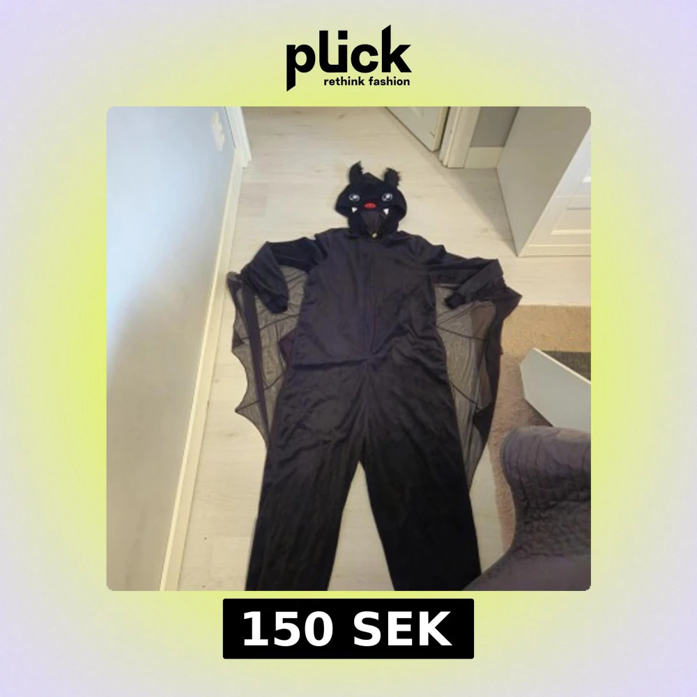 Cool svart fladdermusdräkt från Divided med huva som har stora ögon, öron och tänder. Dräkten har dragkedja framtill och vingar i transparent mesh mellan ärmarna och sidorna. Perfekt för halloween eller maskerad!
