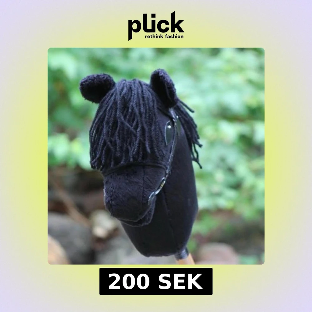 Charmig svart käpphäst i fint skick. Perfekt för lek och äventyr i trädgården eller parken. Handsydd och köpt för över 500 kr.