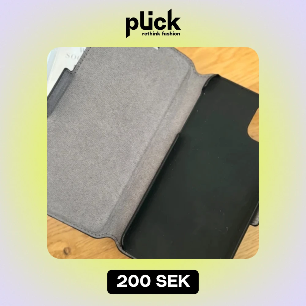Säljer ett stilrent svart mobilfodral från iDeal of Sweden. Fodralet har en elegant design med en guldig logotyp på framsidan. Det finns plats för kort på insidan, vilket gör det praktiskt och snyggt. Perfekt för att skydda din mobil med stil!
