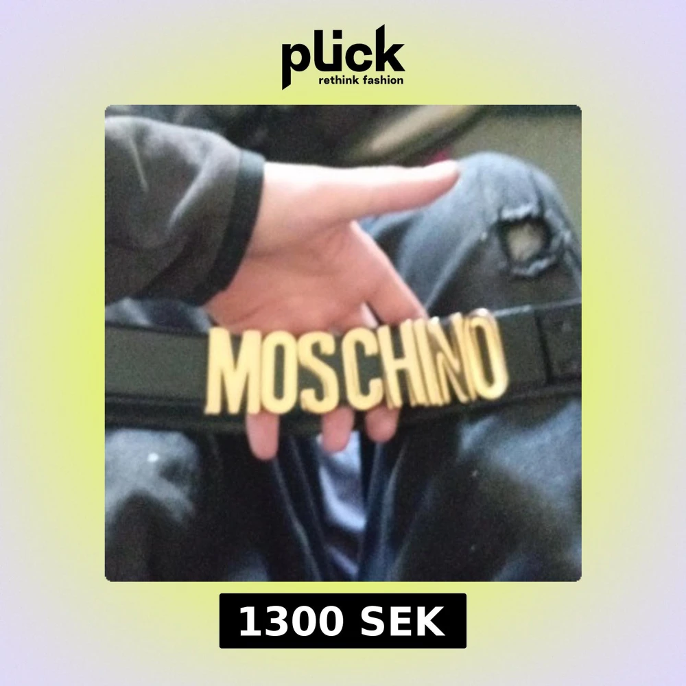 Säljer ett svart bälte från Moschino i äkta läder med stora, guldiga bokstäver framtill. Bältet är stilrent och har en bred design som verkligen sticker ut. Perfekt för dig som vill ha något lite mer annorlunda men fortfarande stilrent. Bältet är äkta och köpt på zalando för 3000kr
