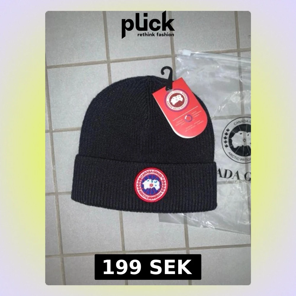 Säljer en svart ribbstickad mössa med klassisk rund logotyp framtill. Mössan är tillverkad i mjuk ull och har en bred uppvikt kant för extra värme. Perfekt för kalla dagar och snygg till streetwear.