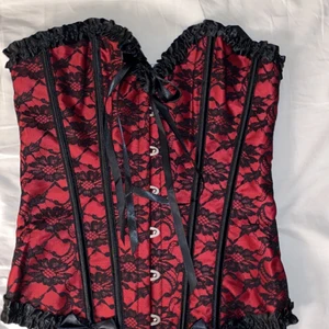 Röd korsett med svart spets och rosetter längst ner i storlek xs.