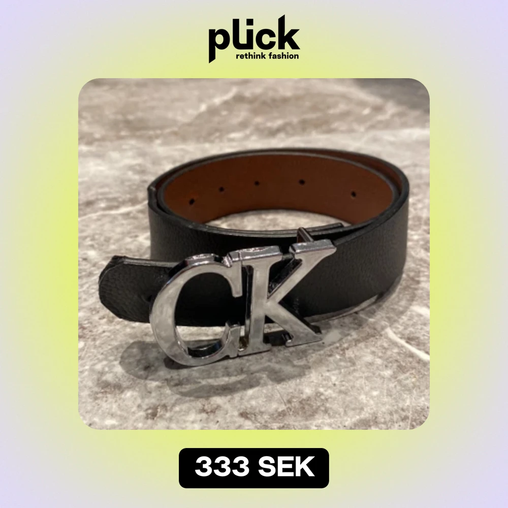 Ett elegant svart skärp med ett stort metallspänne i form av bokstäverna CK. Skärpet är tillverkat av skinn och har en slät yta.
