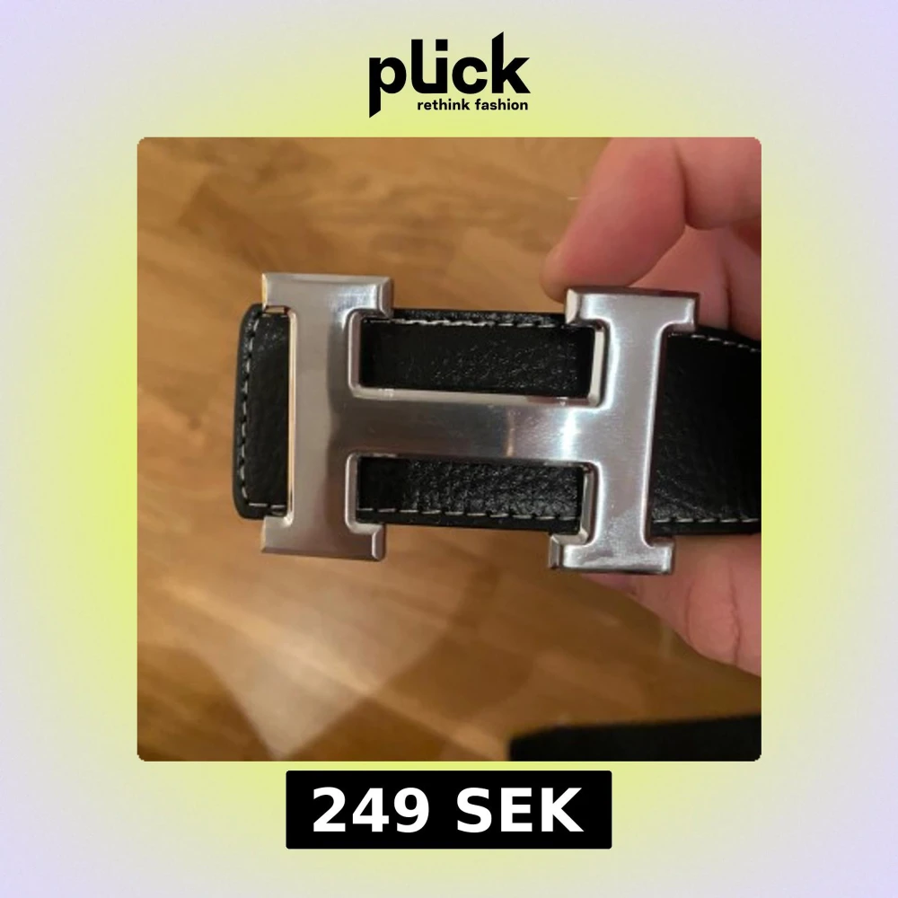 Säljer ett svart bälte i skinn med det ikoniska H-spännet i silverfärgad metall. Bältet har en stilren och klassisk design med vita sömmar längs kanterna. Perfekt för att lyfta din outfit med en lyxig touch.