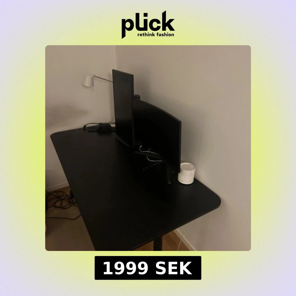 Säljer ett svart trä skrivbord med rektangulär form. Bordet har en slät yta och robusta ben i metall. Perfekt för hemmakontoret eller gaminghörnan.