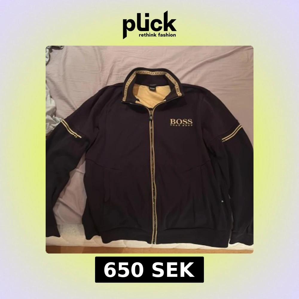 Svart track jacket från Hugo Boss med gulddetaljer och logga på bröstet. Jackan har hel dragkedja, ribbad krage med BOSS-tryck och guldfärgade ränder längs ärmarna. Perfekt för en clean och sportig look. Tröjan är nästan helt oanvänd och är i väldigt bra skick och är en storlek som passar alla