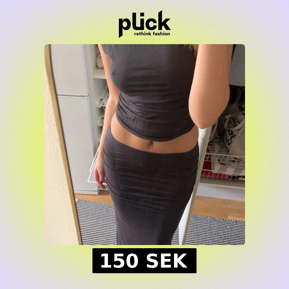 Säljer en mörkgrått set med tight passform. Klänningen består av en crop top och en lång kjol i ett stretchigt material. Perfekt för dig som vill ha en stilren och trendig look. Storlek S