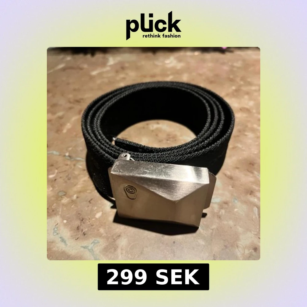 Snyggt svart bälte i slitstarkt tyg med ett coolt, geometriskt silverfärgat metallspänne. Spännet har en unik design med en liten logotyp ingraverad. . Den är 117 cm lång inklusive allt. Ny pris för bältet är 499 kr