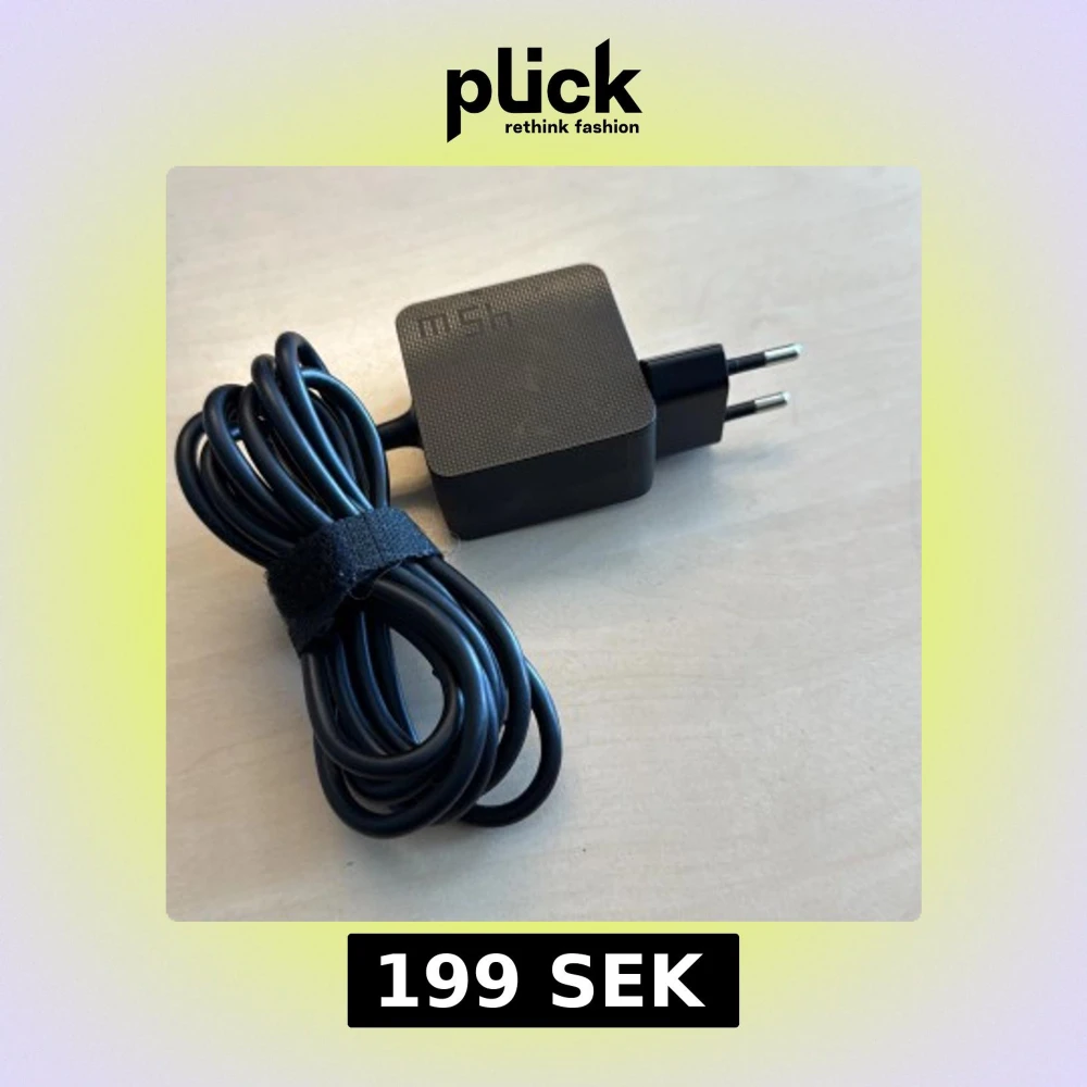 Säljer en svart USB-C laddare med europeisk kontakt. Laddaren har en fyrkantig form och en lång, svart kabel som hålls ihop med kardborreband. Perfekt för laddning av laptop eller andra enheter med USB-C.