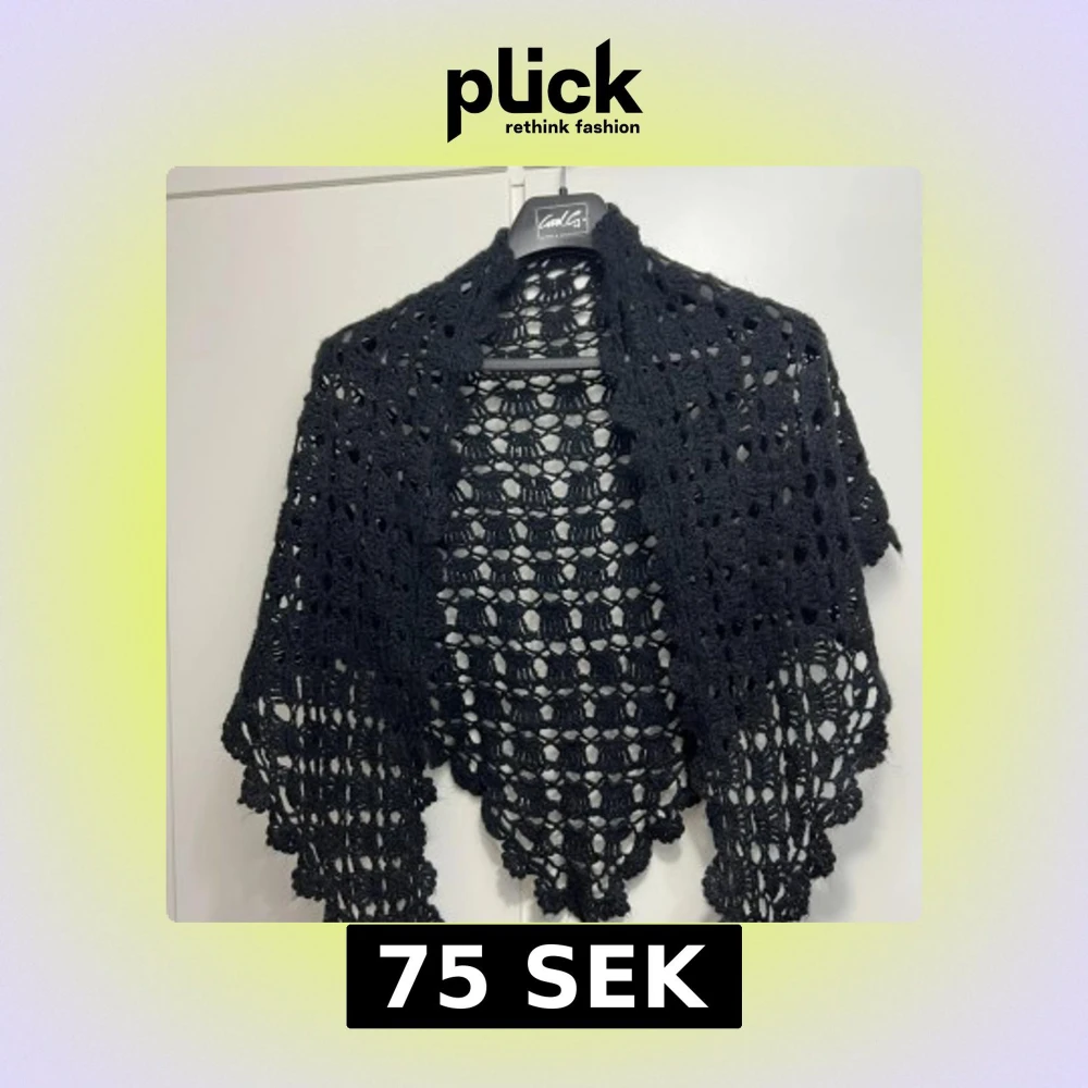 Säljer en svart, handvirkad halsduk från Emalj med ett snyggt öppet mönster och spetsiga kanter. Halsduken är stor och har en cool bohemisk vibe, perfekt att slänga över axlarna för extra stilpoäng. Materialet känns mjukt och är stickat.