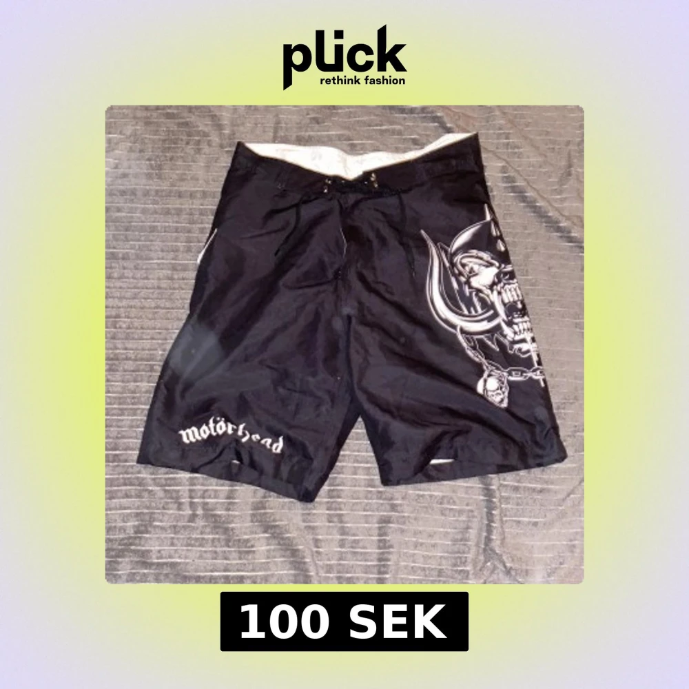 Coola svarta bad shorts med ett stort tryck av Motörheads ikoniska logga på ena benet. Shortsen har snörning i midjan och är perfekta för fans av bandet.