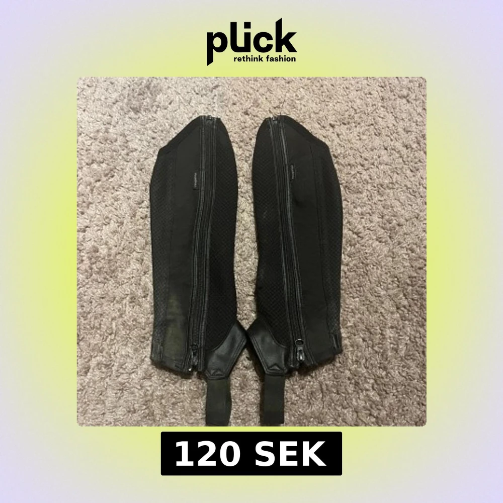 Säljer ett par svarta ridchaps från Fouganza. De är tillverkade i en kombination av skinn och syntetmaterial, med dragkedja längs sidan och elastiska band nedtill. Dock lite skavanker då de är mycket använda.