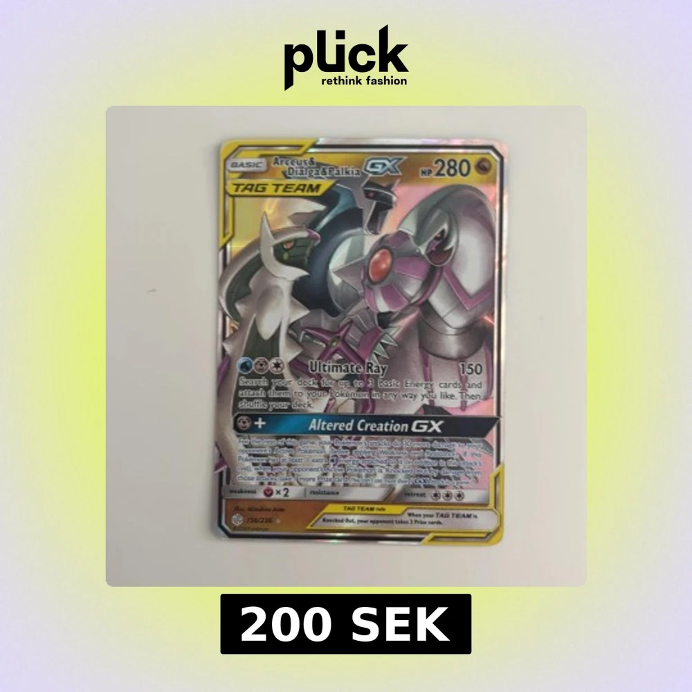 Cool Pokémon GX-kort med Arceus, Dialga och Palkia i ett episkt team! Perfekt för samlare och spelare som vill boosta sin lek med kraftfulla attacker och snygg design. Ett måste för alla Pokémon-fans! Kortet är i riktigt fint skick då jag hade gett det en 8.8/10, Ifall ni har några frågor är det bara att höra av er, ifall ni är intresserade av pokemon kort kolla gärna mer på min profil!