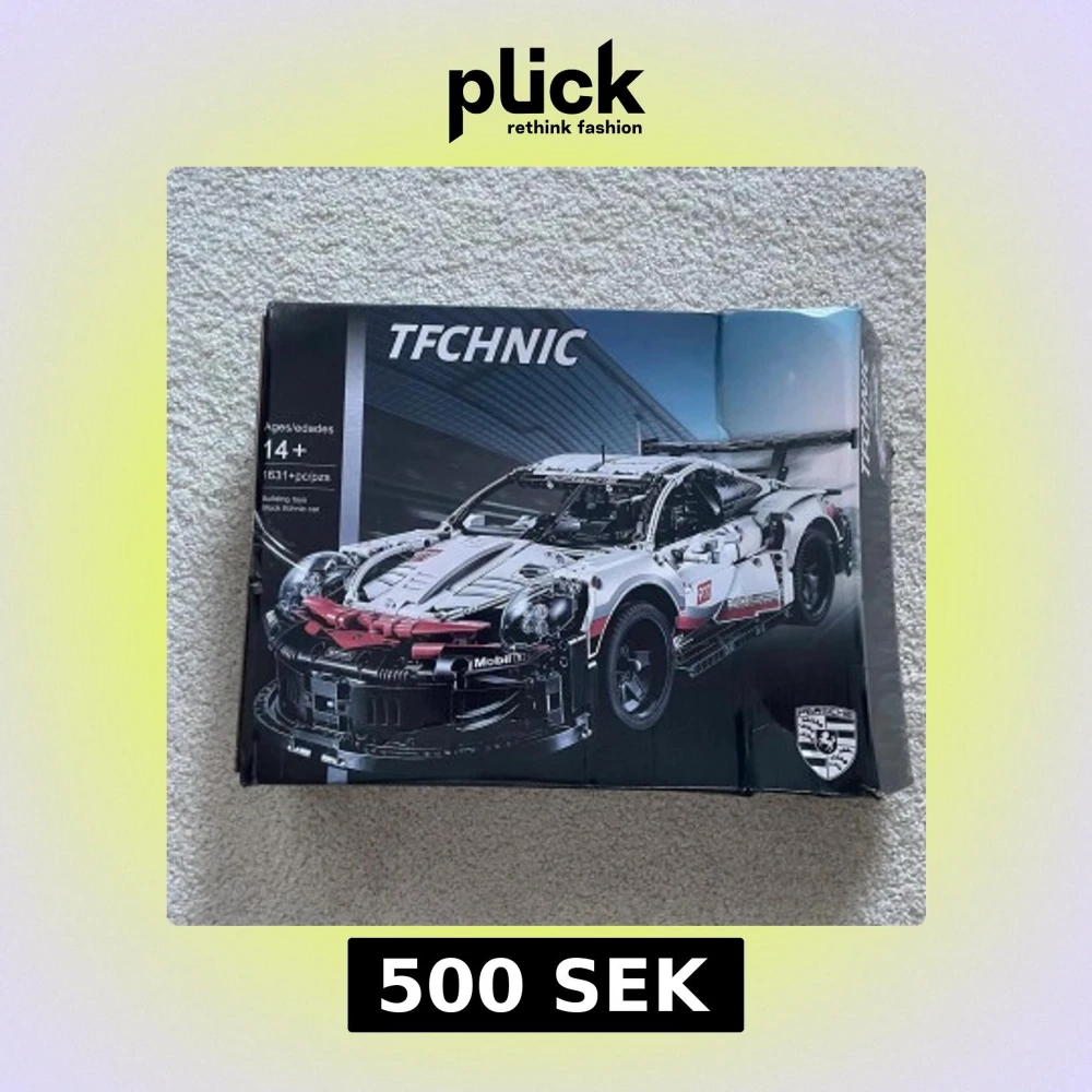 Byggsats av Porsche 911 RSR med 1631+ delar, rekommenderad ålder 14+. Komplett med manual och alla delar i påsar. Kartongen har synliga skador men innehållet ser oanvänt ut. Perfekt för bil- och teknikentusiaster.