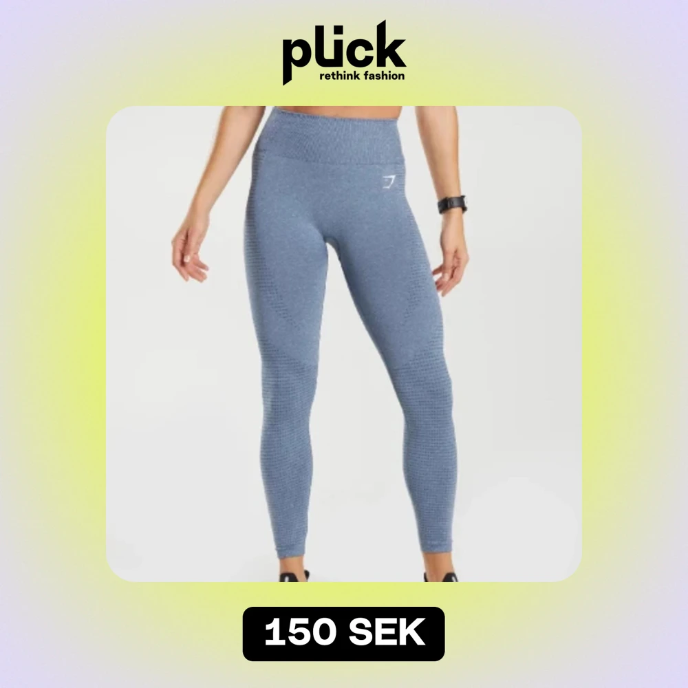 Blå träningstights från gymshark Storleken är antingen M eller L men har tyvärr klippt bort lapparna. Har ett litet hål längst ned på ena benet, men i övrigt väldigt bra skick!!